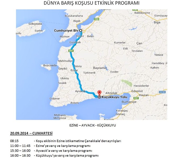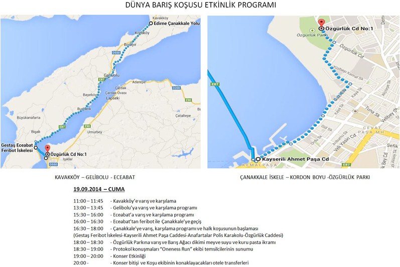 Uluslararası dostluğu ve anlayışı teşvik etmeyi amaçlayan küresel bir bayrak yarışı olan "Dünya Barış Koşusu" Çanakkale etabı 19-20 Eylül 2014 tarihinde ilimizde yapılacaktır. Eceabat'tan Çanakkale'ye 19 Eylül Cuma günü 16:00 feribotuyla geçecek olan sporculara Feribot İskelesinde karşılama töreni yapılacaktır. Törenin ardından ise başlayacak olan halk koşusu özgürlük parkında tamamlanacaktır. Tüm halkımız davetli olup koşunun ardından barış ağacı dikimi yapılacaktır. Etkinlikler saat 19:00'da başlayacak olan konser ile tamamlanacaktır.